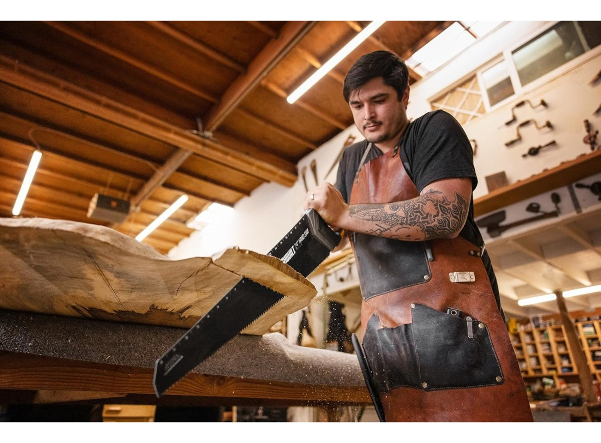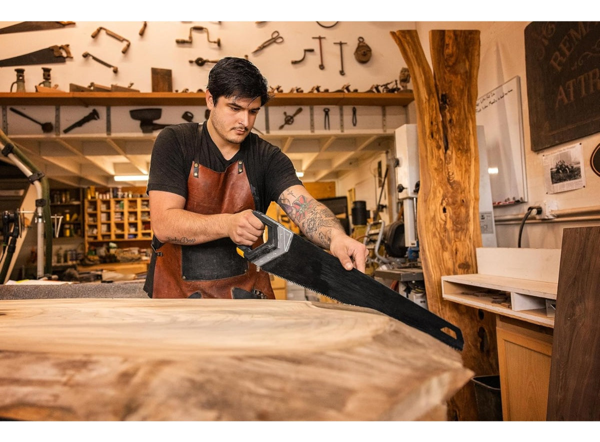 - La sierra cuenta con una carcasa metálica para la hoja que optimiza la rigidez y el control, además de un compartimento para lápiz de carpintero integrado en el mango
