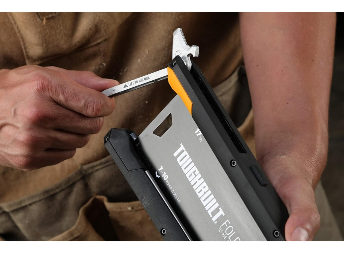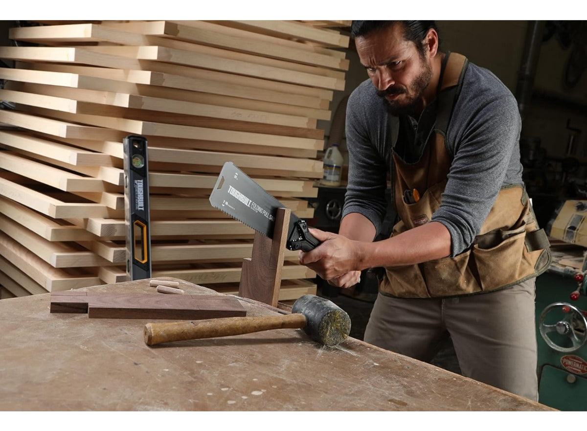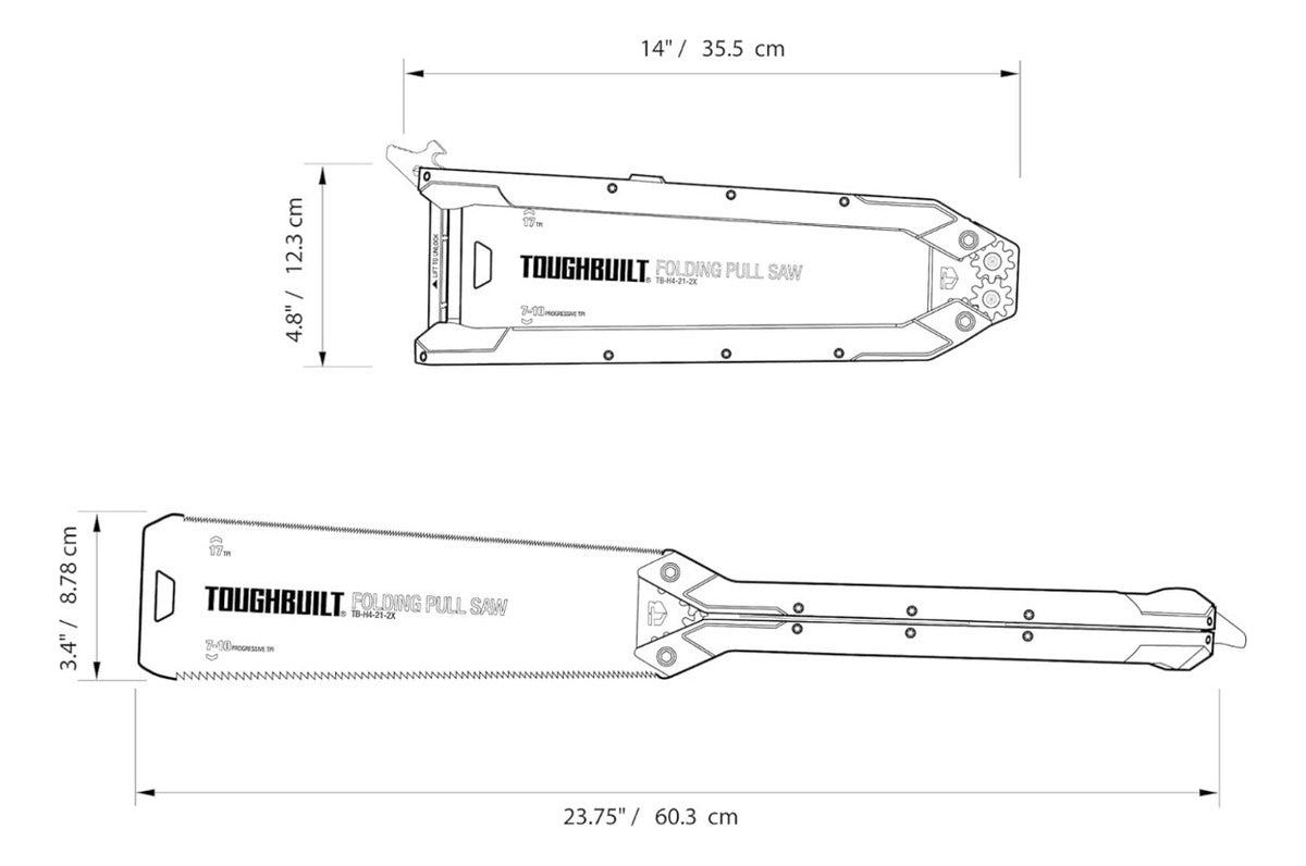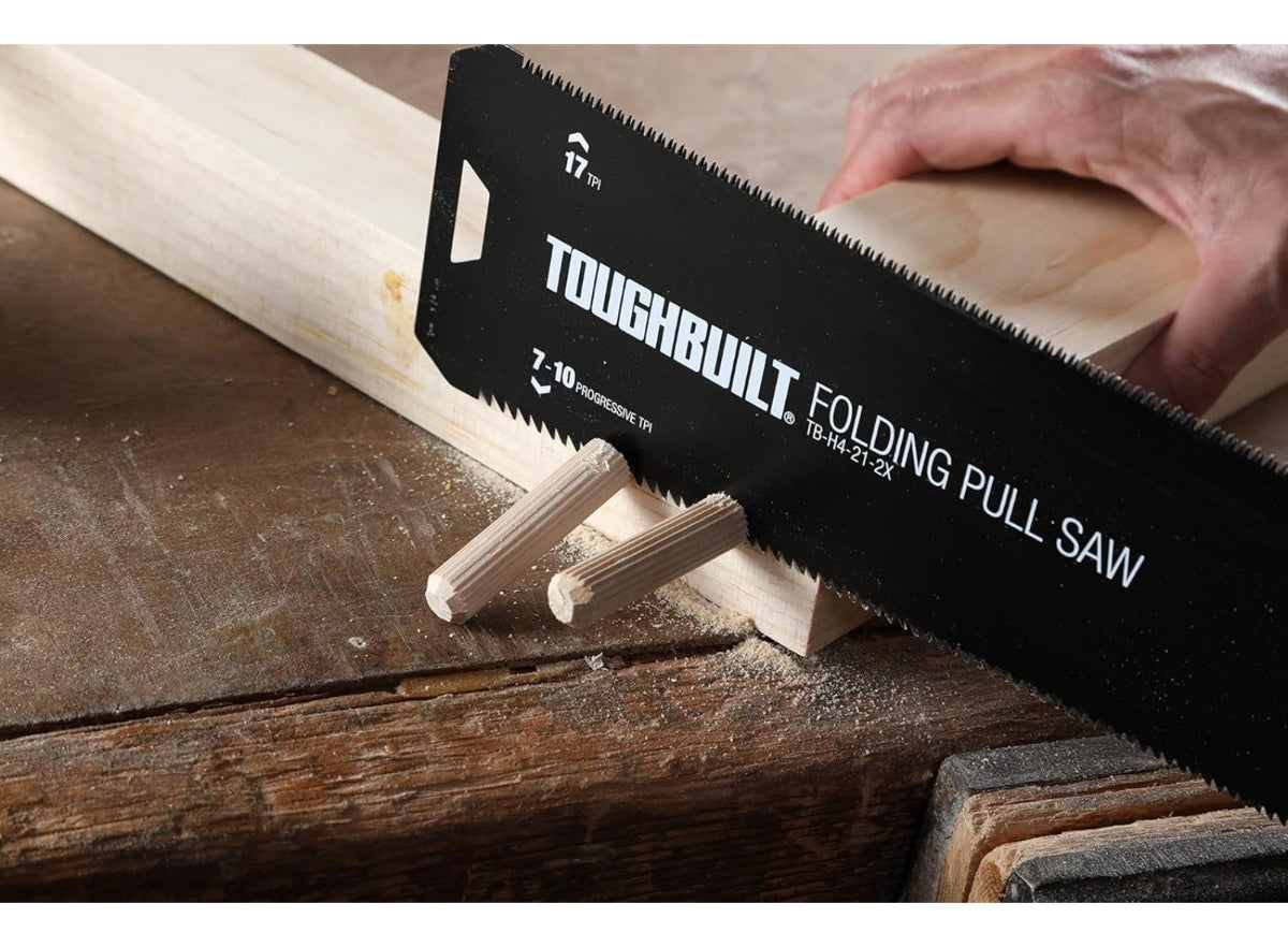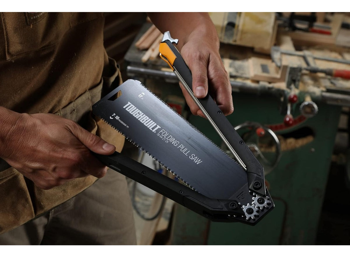 La sierra de arrastre plegable ToughBuilt, integra el compartimento de la hoja en el mango, ofreciendo al usuario una sierra de arrastre de tamaño completo y un almacenamiento compacto. Su mango moldeado por inyección proporciona máxima comodidad y control. Una subestructura de acero aumenta la durabilidad y la rigidez, lo que permite cortes más rectos con menos esfuerzo. Una hoja de doble filo, con un filo de 17 dientes por pulgada (TPI) y uno progresivo de 7 a 10 dientes por pulgada (TPI), ofrece múltiples opciones de corte de acabado.